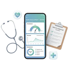 Você terá acesso a um check-up de saúde para acompanhar sua evolução durante o processo de emagrecimento. Assim você pode avaliar indicadores importantes como: Colesterol, glicose e metabolismo.